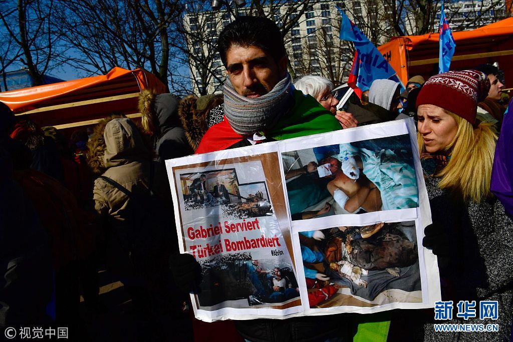 當(dāng)?shù)貢r(shí)間2018年3月3日,德國(guó)柏林,當(dāng)?shù)孛癖娕e行游行,抗議土耳其對(duì)敘利亞阿夫林地區(qū)的庫(kù)爾德人采取軍事行動(dòng)。(圖片來(lái)源:視覺(jué)中國(guó))