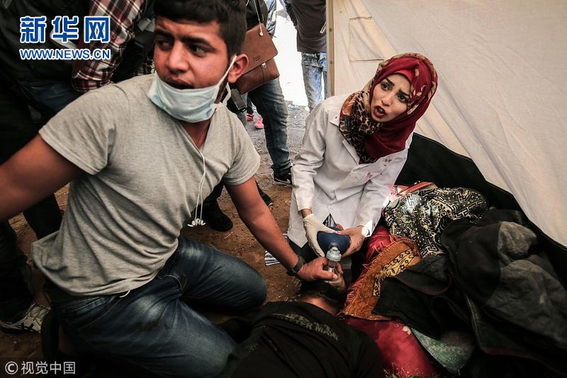 4月1日,加沙汗尤尼斯,在加沙地帶邊境沖突中受傷的巴勒斯坦人被送醫(yī)治療。巴勒斯坦人與以色列士兵30日在加沙地帶邊境爆發(fā)沖突,導(dǎo)致16名巴勒斯坦人死亡、上千人受傷。這天成為2014年巴以沖突后死傷最慘重的一天。(圖片來源:視覺中國)