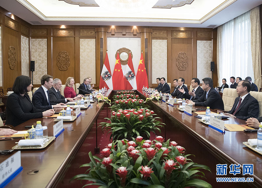 李克強歡迎范德貝倫總統和庫爾茨總理聯袂訪華。他表示,奧地利是中國在歐洲的重要伙伴。習近平主席同總統先生舉行會談,共同規劃兩國關系未來發展。中方愿同奧方抓住機遇,對接發展戰略,深化人文交流合作,加強在國際事務中的溝通協調,全面提升兩國關系水平。