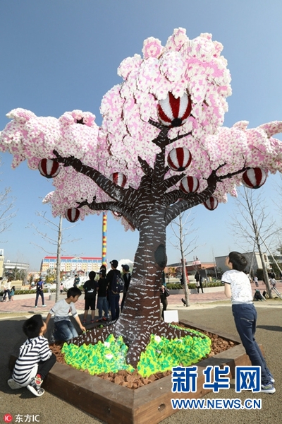 當地時間2018年3月28日,日本名古屋,日本樂高樂園主題公園用樂高積木堆出一棵櫻花樹,被吉尼斯世界紀錄認證為世界最高的樂高櫻花樹。(圖片來源:東方IC)