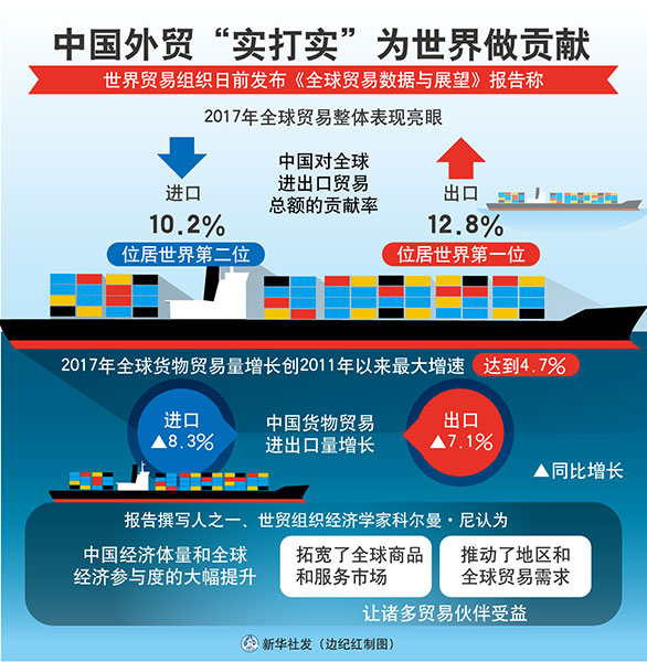 世界貿(mào)易組織日前發(fā)布《全球貿(mào)易數(shù)據(jù)與展望》報(bào)告稱,2017年全球貿(mào)易整體表現(xiàn)亮眼,中國對全球進(jìn)出口貿(mào)易總額的貢獻(xiàn)率高達(dá)10.2%和12.8%,分別位居世界第二和第一位。這再次表明,作為世界第一大貨物貿(mào)易國,中國已成為拉動全球貿(mào)易巨輪前行的重要推動力。