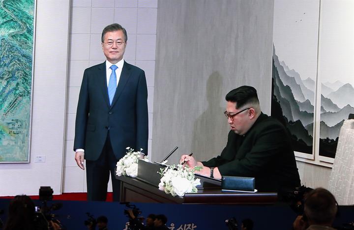 金正恩在板門店韓方一側(cè)的“和平之家”留言簿上題詞