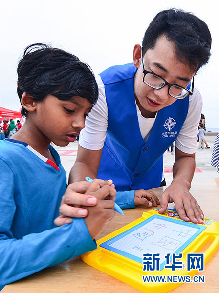 5月4日,在馬爾代夫首都馬累市中心停機坪廣場,中國志愿者教當(dāng)?shù)貎和瘜憹h字。新華社發(fā)(杜才良 攝)