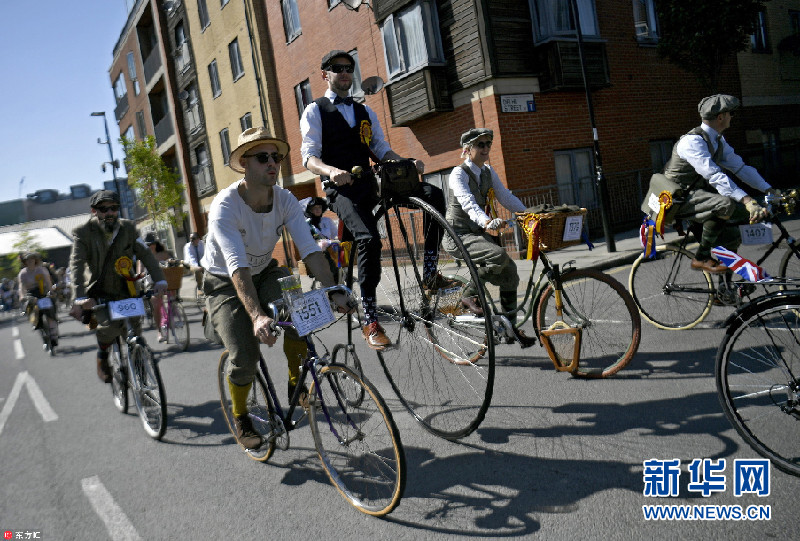 當地時間2018年5月5日,英國倫敦,當地舉辦復古騎行活動,民眾身穿花呢子服裝騎車穿行在倫敦街頭。今年是該活動舉辦十周年。(圖片來源:東方IC)