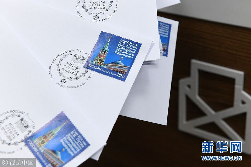 當?shù)貢r間2018年5月7日,俄羅斯莫斯科,俄羅斯發(fā)行普京就職紀念郵票。(圖片來源:視覺中國)