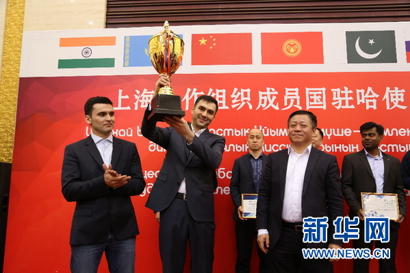 ? 中國駐哈薩克斯坦大使張漢暉(前排右一)為冠軍獲得者塔吉克斯坦隊頒發(fā)獎杯。 新華網發(fā) 阿比洛夫攝