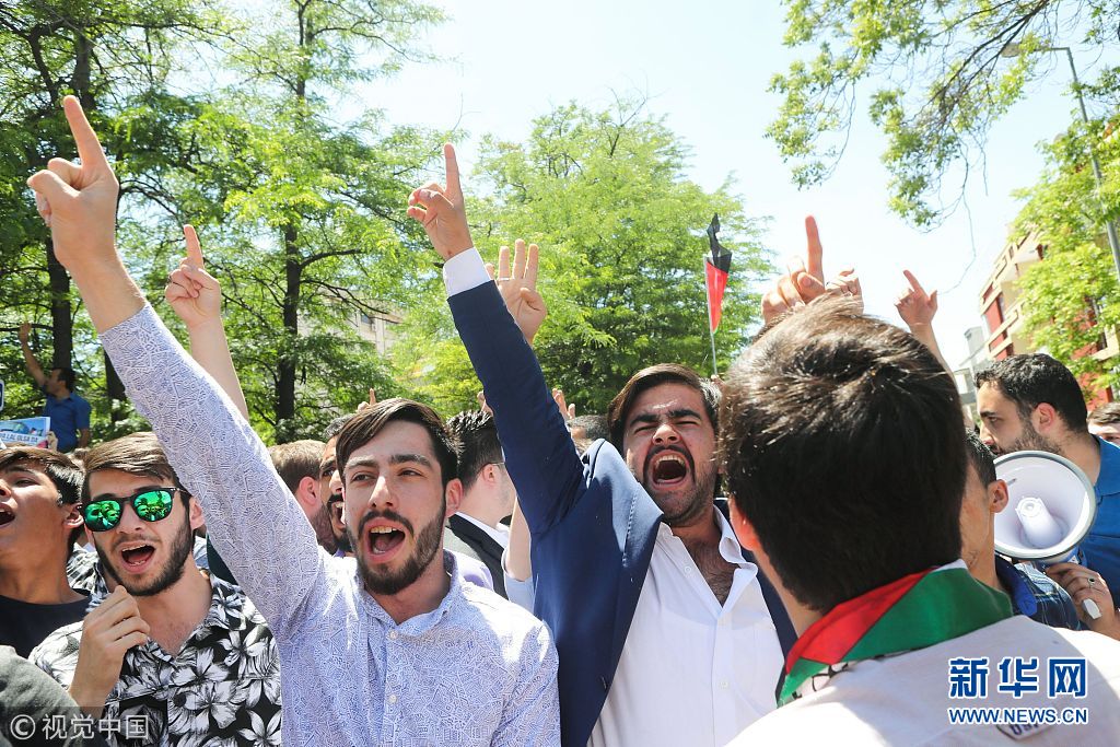 5月15日,土耳其安卡拉,示威者在以色列領(lǐng)事館附近投擲雞蛋和石塊,抗議美國駐以色列使館遷至耶路撒冷。(圖片來源:視覺中國)