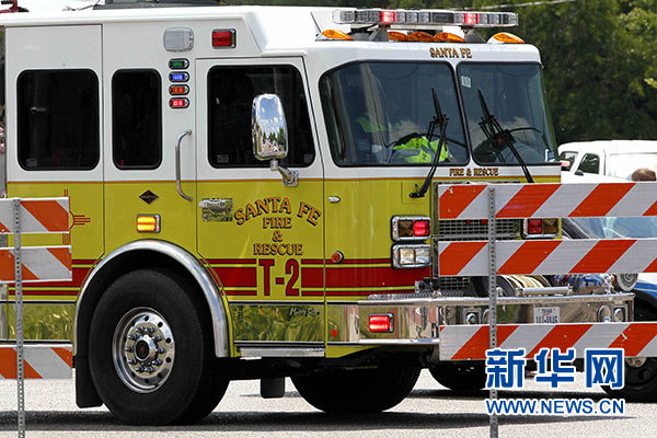 5月18日,在美國得克薩斯州加爾維斯頓郡圣菲市,一輛消防救援車在發生槍擊的圣菲高中附近待命。新華社發(宋穹 攝)