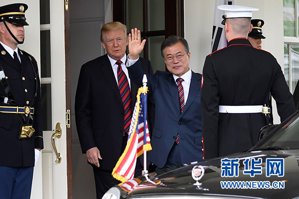 5月22日,美國總統特朗普(左二)在華盛頓白宮歡迎到訪的韓國總統文在寅(左三)。 新華社記者楊承霖攝