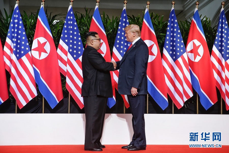 6月12日,朝鮮最高領(lǐng)導(dǎo)人金正恩(左)與美國(guó)總統(tǒng)特朗普在新加坡舉行會(huì)晤。 新華社發(fā)(新加坡海峽時(shí)報(bào)供圖)