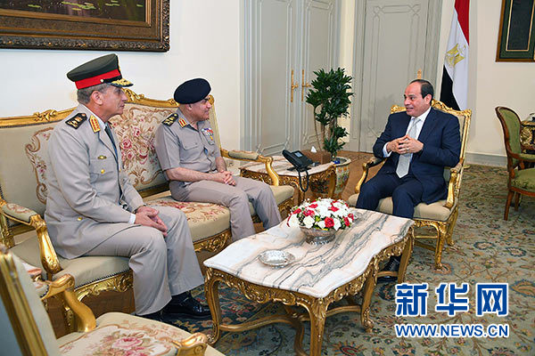 6月14日,在埃及首都開羅,埃及總統(tǒng)塞西(右一)和本屆內(nèi)閣新當(dāng)選成員國防部長穆罕默德·扎基(左一)和前任國防部長西德基·蘇卜希(左二)交談。新華社/中東社