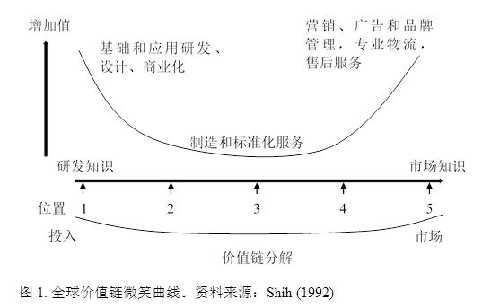 全球價(jià)值鏈構(gòu)建了一個(gè)跨國或者跨地區(qū)不同公司實(shí)現(xiàn)不同的工序和商業(yè)功能的生產(chǎn)架構(gòu)(Grossman和Rossi-Hansberg,2012)。這個(gè)架構(gòu)是“生產(chǎn)性的(價(jià)值增長的)通向并且支持最終使用的順序” (Sturgeon 2001)。微笑曲線提出了一種不同的解構(gòu)國際貿(mào)易的方法。有些國家專業(yè)化“生產(chǎn)”知識與研發(fā),而另一些國家專業(yè)化于制造業(yè),或者品牌營銷。因此,一個(gè)產(chǎn)品的增加值不再是完全屬于某一個(gè)國家,而是整條價(jià)值鏈上的參與者都可以分一杯羹。在為最終產(chǎn)品貢獻(xiàn)價(jià)值的生產(chǎn)工序的鏈條上(既,產(chǎn)品的價(jià)值鏈),一般的工序鏈條開始于基礎(chǔ)和應(yīng)用研究與設(shè)計(jì)。這些研究與設(shè)計(jì)活動往往會帶來新的想法、技術(shù)、新產(chǎn)品設(shè)計(jì)和新的生產(chǎn)工藝。這個(gè)工序鏈條下一環(huán)節(jié)是商業(yè)化這些研究成果,如專利和知識產(chǎn)權(quán)(想法、論文、知識等);再下一環(huán)節(jié)是資源的獲取和材料的生產(chǎn)(包括農(nóng)業(yè)產(chǎn)品),零部件的生產(chǎn)和產(chǎn)品的組裝,以及最后環(huán)節(jié)的營銷、廣告、品牌管理、物流、商業(yè)服務(wù)和售后服務(wù)。另外,價(jià)值鏈在文獻(xiàn)中的定義是超出中間品貿(mào)易的,它強(qiáng)調(diào)在不同環(huán)節(jié)上領(lǐng)先企業(yè)與供應(yīng)商之間的權(quán)力架構(gòu) (Milberg,2004)。