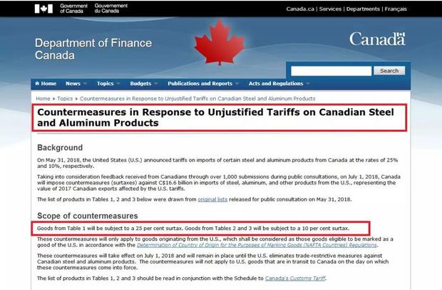加拿大財政部官網發布的公告,標題可以說是相當地直抒胸臆了:《對加拿大鋼鋁產品受到不公平關稅待遇的反擊措施》(Countermeasures in Response to Unjustified Tariffs on Canadian Steel and Aluminum Products)。抱怨三連:countermeasures(對抗措施), in Response to(對……做出反應),unjustified(不公平的)——看得出,加拿大是真生氣了。