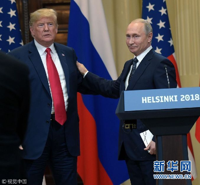 當地時間2018年7月16日,芬蘭赫爾辛基,美國總統特朗普與俄羅斯總統普京出席聯合新聞發布會。(圖片來源:視覺中國)
