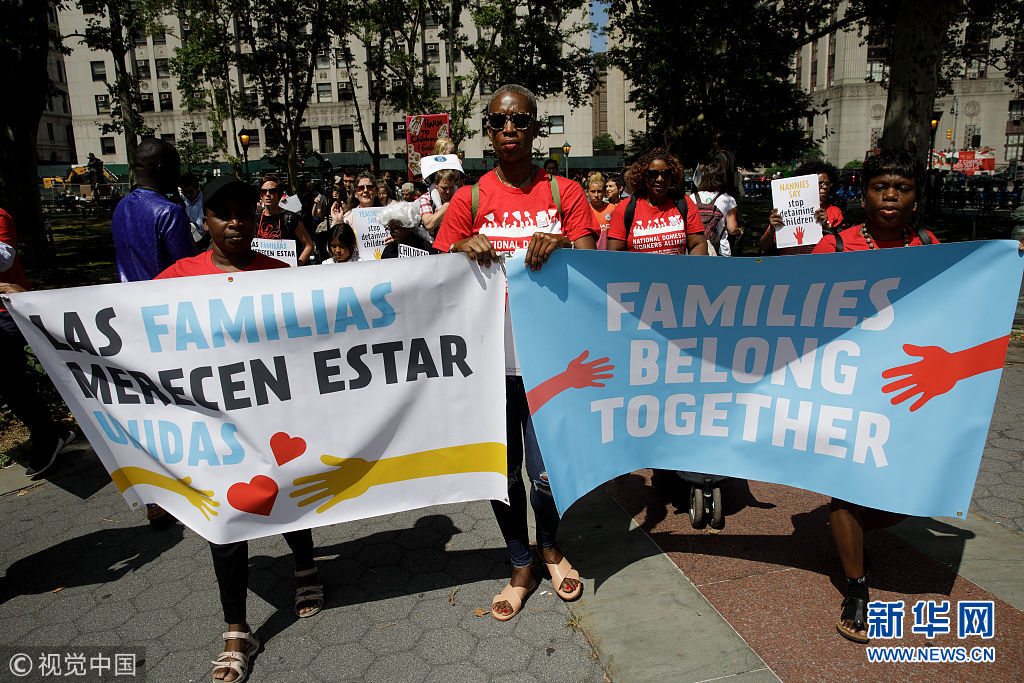 當地時間2018年7月18日,美國紐約,包括托兒所從業人員、父母及其子女在內的社會各界人士在美國移民和海關執法局(ICE)附近組織示威游行,抗議特朗普政府近期在美國南部邊境實施針對非法移民家庭的強制拘留和家庭成員離散政策。 當天,共和黨領導的眾議院通過了支持ICE的決議,并譴責一些民主黨人和進步積極分子要求廢除ICE的呼聲。(圖片來源:視覺中國)