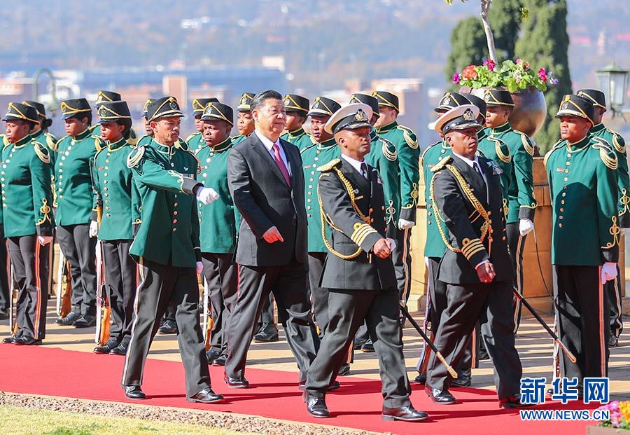 總統府前廣場,微風拂面,陽光和煦。中南兩國國旗迎風飄揚。習近平和夫人彭麗媛受到拉馬福薩和夫人莫采佩熱情迎接。兩國元首夫婦登上檢閱臺。儀仗隊行持槍禮。軍樂隊奏中國國歌。現場鳴放21響禮炮。習近平檢閱儀仗隊。軍樂隊奏南非國歌。習近平和彭麗媛同南方主要官員握手。拉馬福薩夫婦同中方陪同人員握手。兩國元首夫婦親切寒暄。拉馬福薩對習近平在南中建交20周年之際訪問南非并出席金磚國家領導人會晤表示熱烈歡迎。