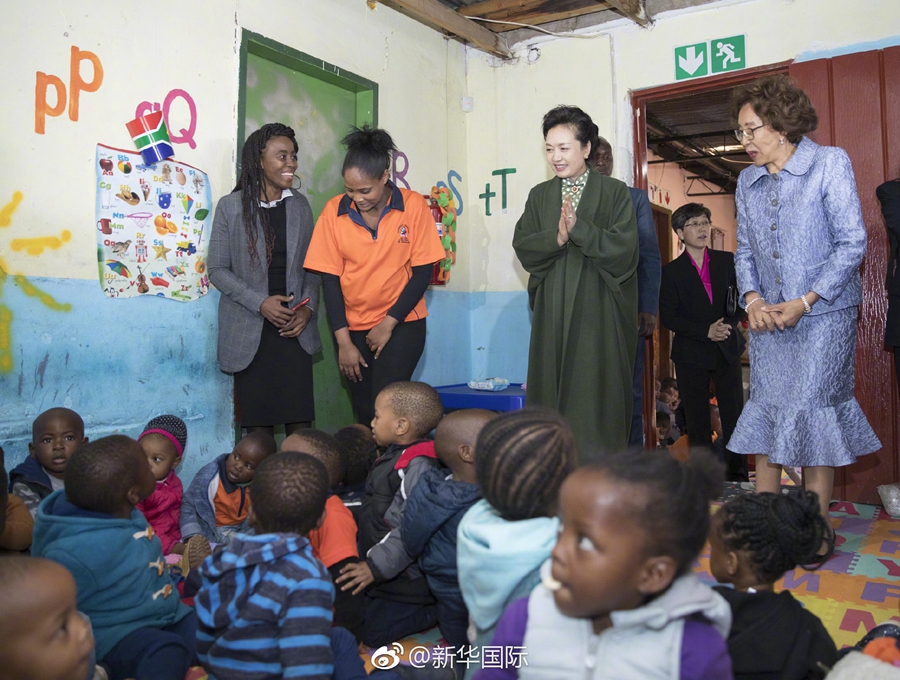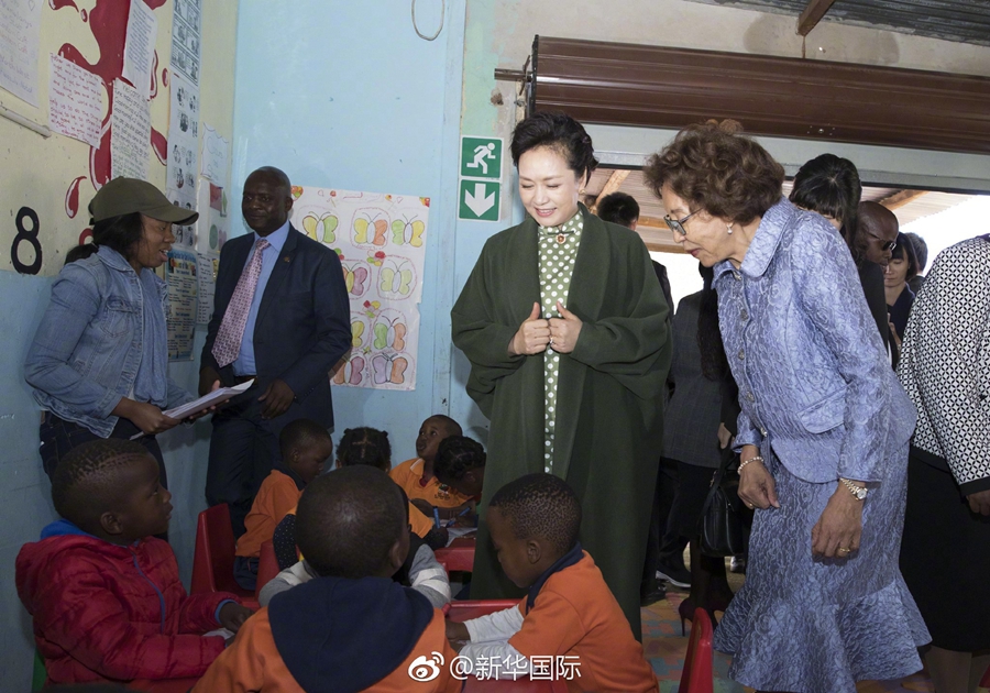彭麗媛和莫采佩抵達時,非洲自助基金會負責人、托兒所園長等在門口迎接。40名活潑可愛的南非兒童揮舞中南兩國國旗列隊歡迎,彭麗媛俯身同孩子們親切握手問候。彭麗媛來到庭院,20多名兒童手持兩國國旗,輪流用中英文高聲呼喊“歡迎歡迎”。孩子們伴著俏皮輕快的舞蹈動作,合唱英文歌曲《歡迎您》、用中文吟唱中國古詩兒歌《詠鵝》、演唱南非說唱歌曲。彭麗媛認真聆聽,頻頻點頭微笑、不時鼓掌稱贊,夸獎孩子們中文發音準確。彭麗媛來到教室,觀看兒童繪畫、識字,和孩子們用當地傳統手語互致問候。彭麗媛向孩子們贈送玩具、文具、圖書,并在孩子們自己創作的手印畫上題寫“前程似錦”,勉勵孩子們好好學習、茁壯成長。彭麗媛表示,兒童成長關乎一個國家未來。兒童早期教育,最重要的是樹德育人,引導他們樹立遠大志向、培育美好心靈。希望中南友好事業從娃娃抓起,讓他們長大后做兩國友好事業的傳承者和接班人。