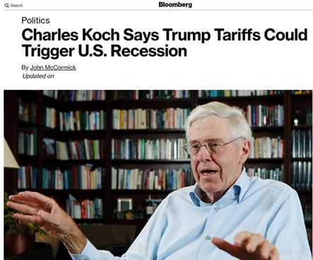 而在上周末剛剛結束的這么一場為期三天、并有數百人參加的活動上,科赫兄弟中年長的哥哥查爾斯·科赫就公開宣布他對美國政府的貿易戰行為很擔憂,認為美國對中國等多個國家揮舞的關稅大棒將令美國經濟面臨“災難性”的衰退風險。