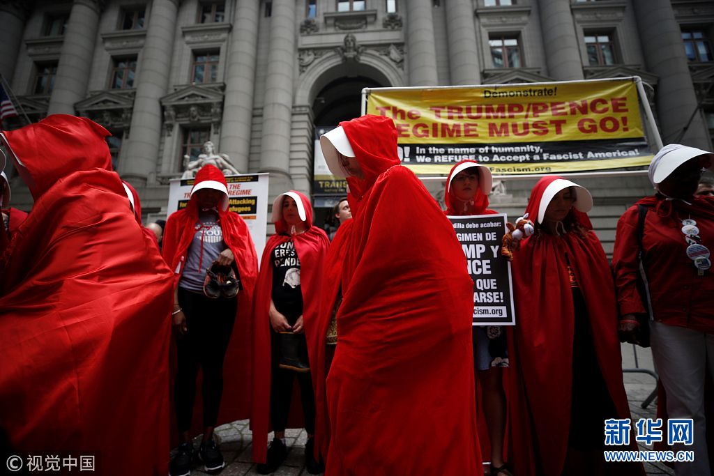 當(dāng)?shù)貢r(shí)間2018年7月31日,美國(guó)紐約,女性示威者扮成美劇《使女的故事》中的“使女”在亞歷山大·漢密爾頓海關(guān)大樓前示威,抗議美國(guó)總統(tǒng)特朗普和副總統(tǒng)麥克·彭斯。她們手持鞋子,代表被迫與父母分離的移民兒童。(圖片來(lái)源:視覺(jué)中國(guó))