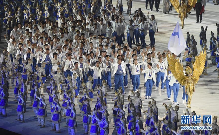 8月18日,第18屆亞運會開幕式在印度尼西亞雅加達舉行。這是朝韓兩國代表團在開幕式上舉“朝鮮半島旗”共同入場(8月18日攝)。新華社記者潘昱龍攝