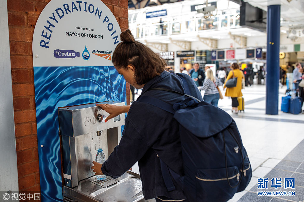 當地時間2018年8月28日,英國倫敦,民眾在公共飲水機旁飲水。倫敦市長近日引進了20個新的公共飲水機,鼓勵人們自帶杯子取水喝,從而減少塑料垃圾。 (圖片來源:視覺中國)