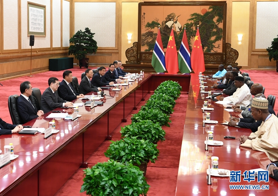 習(xí)近平歡迎岡比亞總統(tǒng)首次出席中非合作論壇會(huì)議,指出這對(duì)中岡關(guān)系、中非關(guān)系、論壇建設(shè)均具有重要意義。習(xí)近平強(qiáng)調(diào),中岡復(fù)交2年多來(lái),雙方友好合作全面、順利推進(jìn),雙邊關(guān)系發(fā)展得很好、很快,中方對(duì)兩國(guó)關(guān)系發(fā)展取得的成果感到滿意。中方贊賞總統(tǒng)先生和岡比亞政府堅(jiān)持一個(gè)中國(guó)原則,愿同岡方繼續(xù)把握好兩國(guó)關(guān)系的大方向,不斷增進(jìn)政治互信,繼續(xù)在涉及彼此核心利益和重大關(guān)切問(wèn)題上相互堅(jiān)定支持。中方支持岡比亞政府“建設(shè)新岡比亞”的努力,愿加強(qiáng)務(wù)實(shí)合作,擴(kuò)大人文交流。中方支持岡方加強(qiáng)和平安全能力建設(shè)。