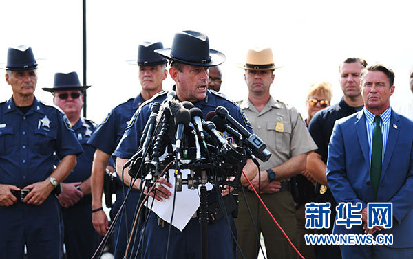 9月20日,在美國東部馬里蘭州哈福德縣,哈福德縣警長杰弗里·加勒(前)在記者會上介紹槍擊案情況。新華社記者 劉杰 攝