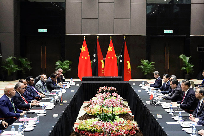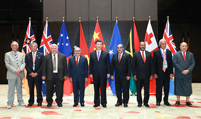 11月16日,國家主席習近平在莫爾茲比港同巴布亞新幾內亞總理奧尼爾、密克羅尼西亞聯邦總統克里斯琴、薩摩亞總理圖伊拉埃帕、瓦努阿圖總理薩爾瓦伊、庫克群島總理普納、湯加首相波希瓦、紐埃總理塔拉吉等建交太平洋島國領導人以及斐濟政府代表、國防部長昆布安博拉舉行集體會晤。習近平主持會晤并發表主旨講話。新華社記者 謝環馳 攝