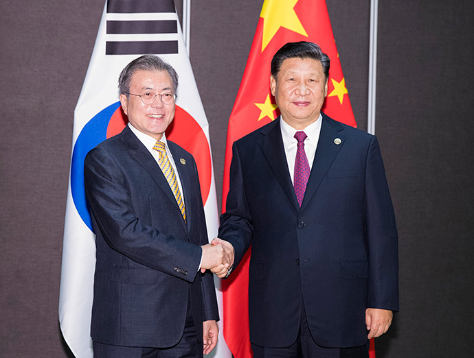 11月17日,國(guó)家主席習(xí)近平在莫爾茲比港會(huì)見(jiàn)韓國(guó)總統(tǒng)文在寅。新華社記者 黃敬文 攝