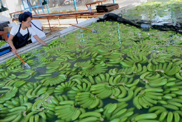 10月30日,一名工人在菲律賓棉蘭老島北達沃省的香蕉種植園清洗香蕉。新華社發(烏馬利攝)