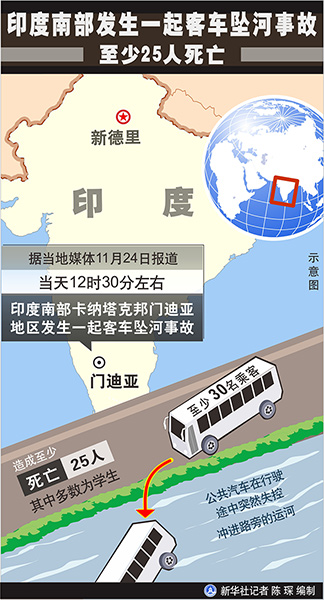 新華社新德里11月24日電(記者趙旭)印度南部卡納塔克邦門迪亞地區(qū)24日發(fā)生一起客車墜河事故,造成至少25人死亡,其中多數(shù)為學生。