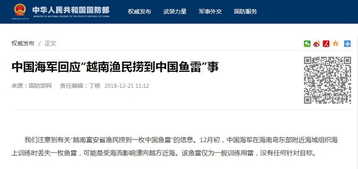 我們注意到有關“越南富安省漁民撈到一枚中國魚雷”的信息。12月初,中國海軍在海南島東部附近海域組織海上訓練時丟失一枚魚雷,可能是受海流影響漂向越方近海。該魚雷僅為一般訓練用雷,沒有任何針對目標。