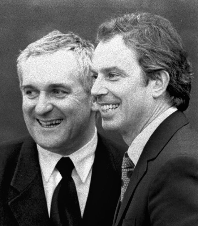 當時,代表愛爾蘭和英國政府簽署協議的分別是時年47歲的愛爾蘭總理伯蒂·埃亨和45歲的英國首相托尼·布萊爾。