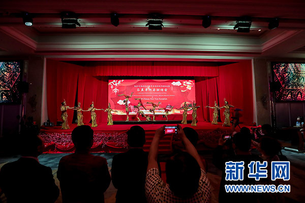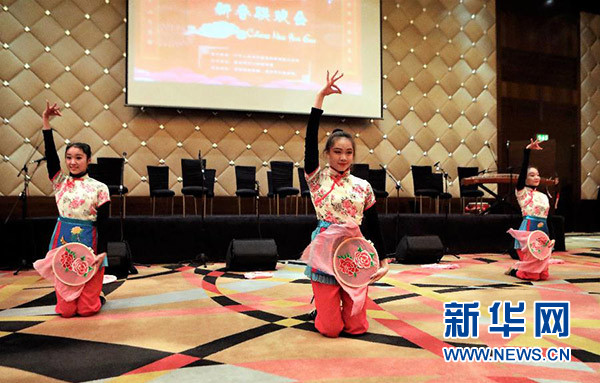 1月30日,在科威特的費(fèi)爾瓦尼耶省,來自南京藝術(shù)團(tuán)的演員在中國駐科威特使館新春招待會(huì)上表演民族舞蹈。新華社發(fā)(約瑟夫 攝)