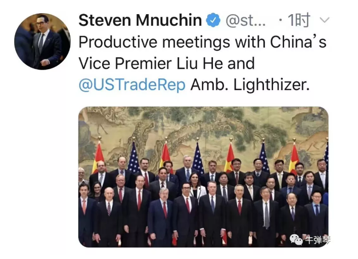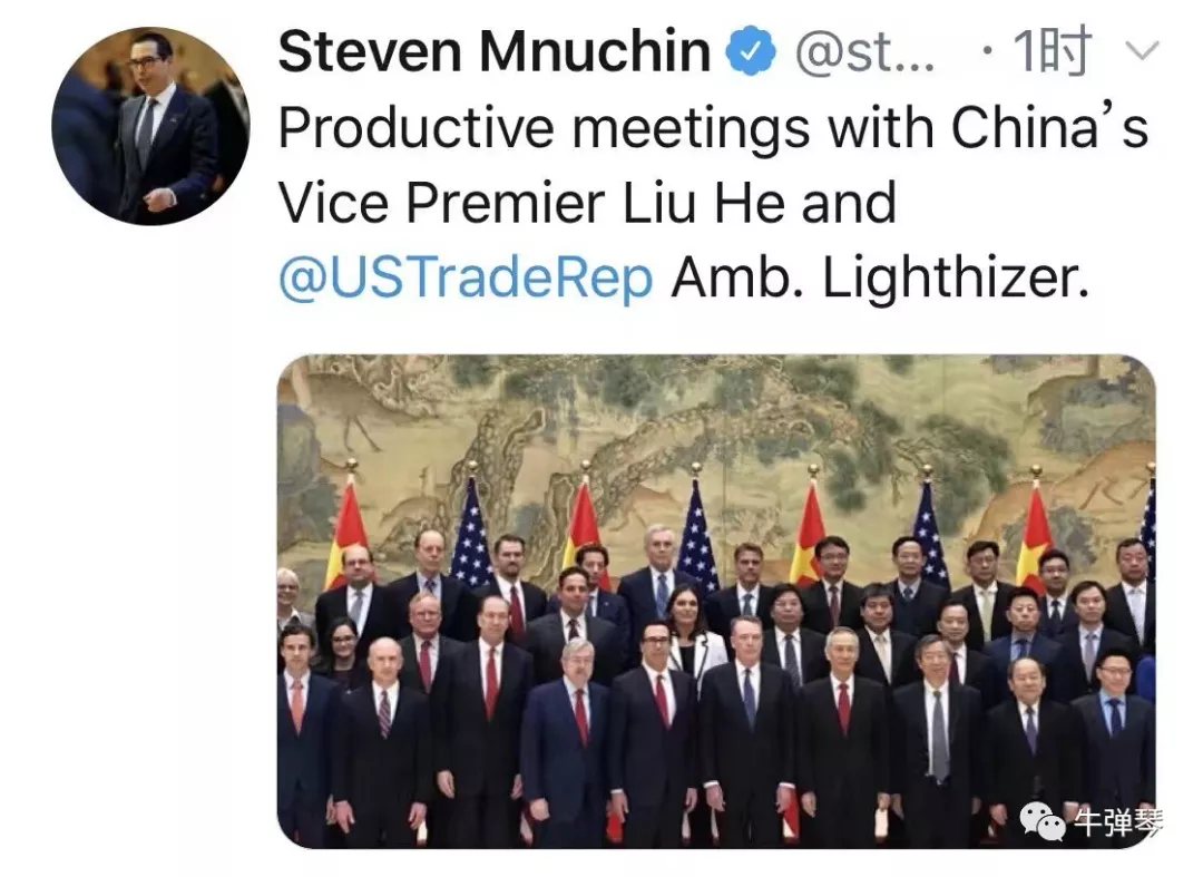 很有意思的,這次磋商一結束,美國財長姆努欽立刻發了一條推特,上面寫道:和劉鶴副總理、萊特希澤大使進行了富有建設性的會議。
