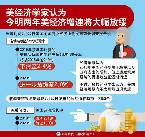 新華社華盛頓3月25日電(記者許緣 鄧仙來)美國全國商業經濟協會25日發布前景調查報告說,該協會經濟學家預測,主要受全球經濟增長放緩和美國貿易政策影響,今明兩年美國經濟增速將大幅放緩。