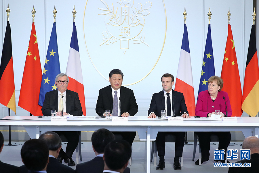 3月26日,國家主席習近平在巴黎同法國總統馬克龍一道出席中法全球治理論壇閉幕式。德國總理默克爾、歐盟委員會主席容克應邀出席。新華社記者 鞠鵬 攝