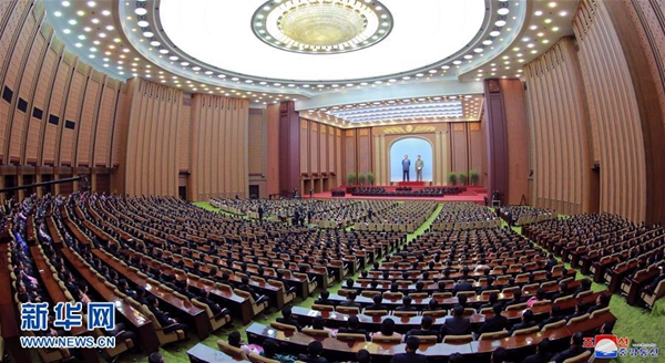 這張朝中社4月12日提供的照片顯示的是11日舉行的朝鮮第14屆最高人民會(huì)議第一次會(huì)議現(xiàn)場(chǎng)。新華社/朝中社