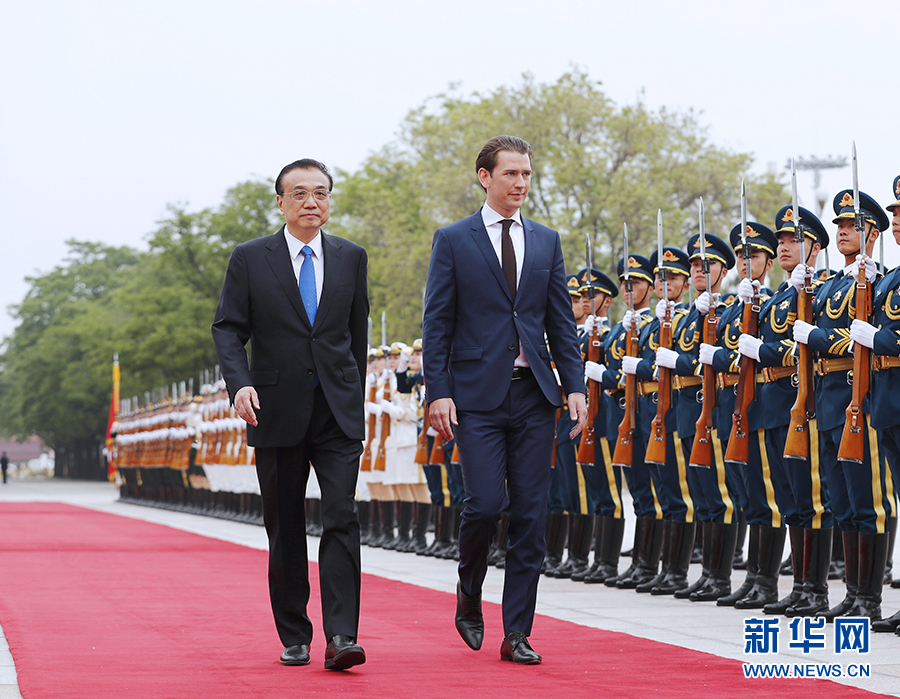 4月28日,國務院總理李克強在北京人民大會堂同奧地利總理庫爾茨舉行會談。這是會談前,李克強在人民大會堂東門外廣場為庫爾茨舉行歡迎儀式。新華社記者 劉彬 攝