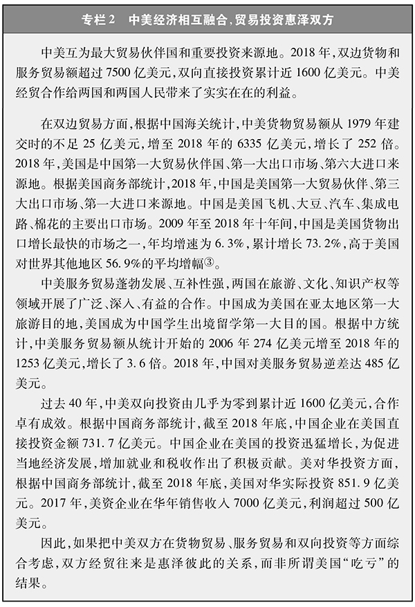 中美經(jīng)貿(mào)關系是兩國關系的“壓艙石”和“推進器”,事關兩國人民根本利益,事關世界繁榮與穩(wěn)定。兩國建交以來,雙邊經(jīng)貿(mào)關系持續(xù)發(fā)展,合作領域不斷拓寬,合作水平不斷提高,形成了高度互補、利益交融的互利共贏關系,不僅兩國受益,而且惠及全球。