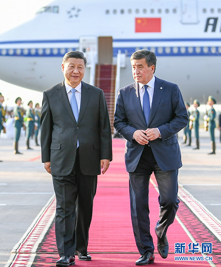 當地時間晚7時40分許,習近平乘坐的專機抵達瑪納斯國際機場。習近平步出艙門,吉爾吉斯斯坦總統熱恩別科夫在舷梯旁熱情迎接。當地女青年向習近平獻上鮮花和面包、蜂蜜,表達對尊貴客人的歡迎。吉爾吉斯斯坦禮兵沿紅地毯兩側列隊,行注目禮。
