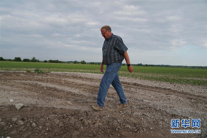 6月9日,在位于美國中部密蘇里州的小鎮奧里克,湯姆·沃特斯走在自己的農田上。新華社記者 劉杰 攝