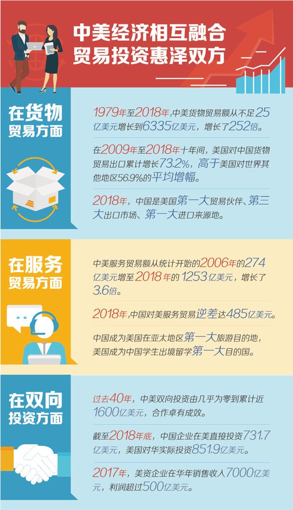 在國際經濟合作中,正常的貿易關系是建立在等價交換基礎上的互惠互利關系,而不是你多我少、你輸我贏的“零和博弈”。國際貿易有利于推動資源在世界范圍內優化配置,促進各國經濟共同發展,推動人類社會共同進步,國際貿易的歷史早已證明這樣的實踐是有效的,實踐經驗也早已成為國際經濟學的基本原理,中美經貿合作的事實也作了同樣的驗證。中美建交以來,在雙邊貿易方面,1979年至2018年,雙邊貨物貿易額從不足25億美元增長到6335億美元,增長了252倍;在雙向投資領域,過去40年,中美雙向投資由幾乎為零到累計近1600億美元,中美互為對方重要投資伙伴,投資的雙向性和互惠性進一步顯現。中美經貿關系發展的歷程證明,中美通過優勢互補、互通有無,有力促進了各自經濟發展和產業結構優化升級,雙方經貿往來是惠澤彼此的關系,而非中國讓美國“吃虧”的過程。