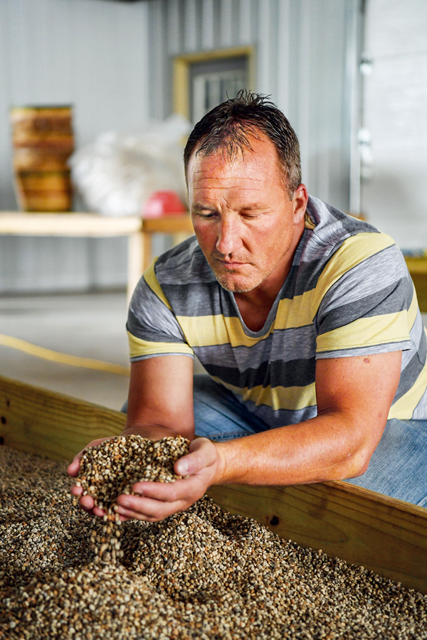 由于美國一些人挑起經貿摩擦,美國農產品遭到其他貿易伙伴反制,出口市場前景黯淡。圖為美國威斯康星州沃索市近郊的農戶喬·海爾愁容滿面地捧起西洋參種子查看,希冀經貿摩擦早日結束。 新華社記者 劉杰/攝