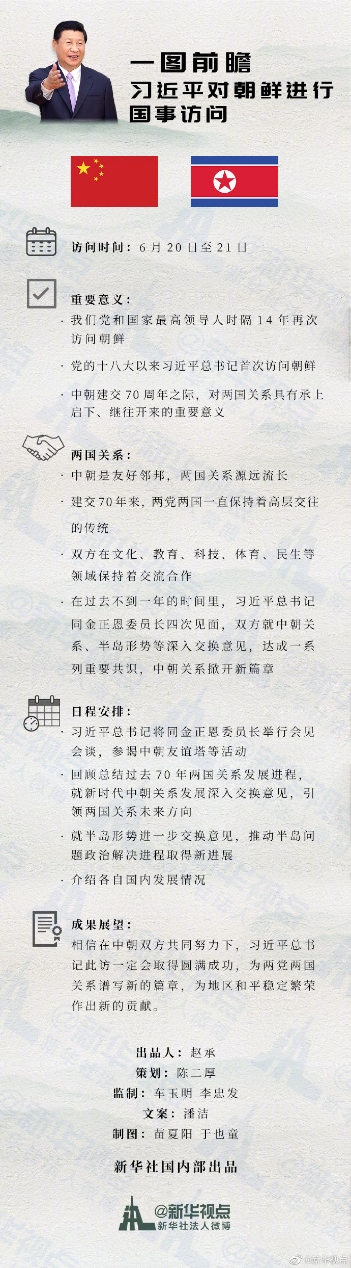 新華社北京6月17日電 中共中央對外聯絡部發言人胡兆明17日在北京宣布:應朝鮮勞動黨委員長、朝鮮民主主義人民共和國國務委員會委員長金正恩邀請,中共中央總書記、中華人民共和國主席習近平將于6月20日至21日對朝鮮民主主義人民共和國進行國事訪問。