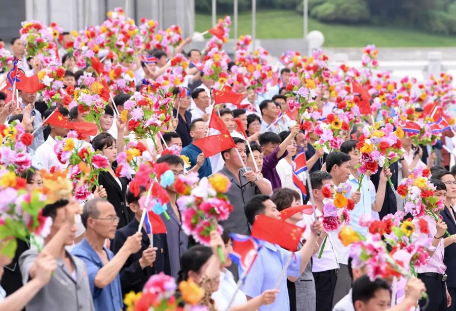 沿途數(shù)十萬群眾揮舞中朝兩國國旗和五彩繽紛的鮮花,熱情洋溢地高呼中朝友誼萬歲等口號。