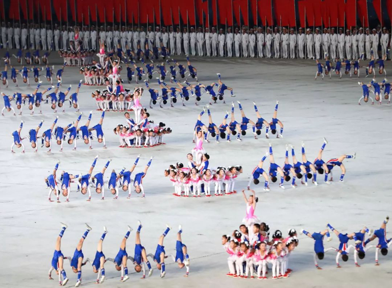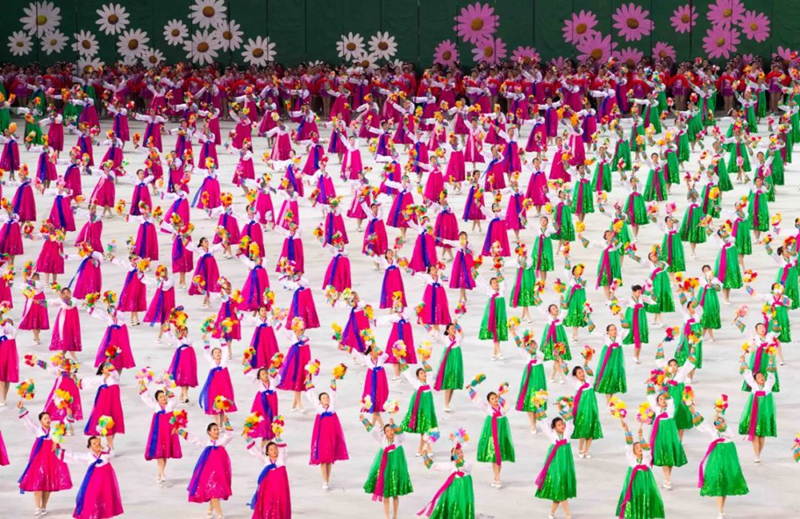 平壤大同江畔,綾羅島“五一”體育場是團體操的主要舞臺。演出以朝鮮民族獨特的“歌舞之美”、富有活力的團體操、嘆為觀止的雜技表演,展現出朝鮮革命與戰爭、政治和軍隊建設、民生與經濟發展以及對外交往的宏偉畫卷。