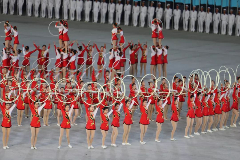 ▲2018年9月9日,演員在平壤綾羅島“五一”體育場表演“輝煌的祖國”。新華社記者邢廣利攝