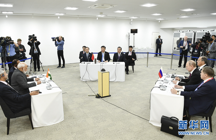 6月28日,國家主席習(xí)近平在大阪出席中俄印領(lǐng)導(dǎo)人會晤,同俄羅斯總統(tǒng)普京、印度總理莫迪就當前國際形勢、重大國際和地區(qū)問題、三方合作深入交換意見。新華社記者 謝環(huán)馳 攝