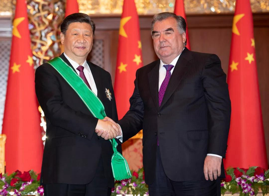 ↑熱恩別科夫總統(tǒng)和拉赫蒙總統(tǒng)分別向習(xí)主席授予各自國家最高獎?wù)拢兄x習(xí)主席為發(fā)展吉中、塔中友誼所作的卓越貢獻(xiàn)。照片分別由新華社記者謝環(huán)馳、沙達(dá)提攝